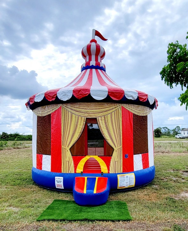 An inflatable bounce house designed with a Big Top Circus theme is a vibrant and eye-catching play area that brings the exhilarating atmosphere of a circus right into your backyard. It's a large, air-filled structure featuring bright colors and designs that mimic the excitement of circus tents, complete with illustrations of cheerful clowns, acrobats, and animals. Perfect for parties, this bounce house invites children to jump, play, and imagine themselves as part of a spectacular circus show, all within the safety of soft, bouncy walls. It’s a hit among kids who dream of being under the big top, turning any event into a fun-filled carnival.