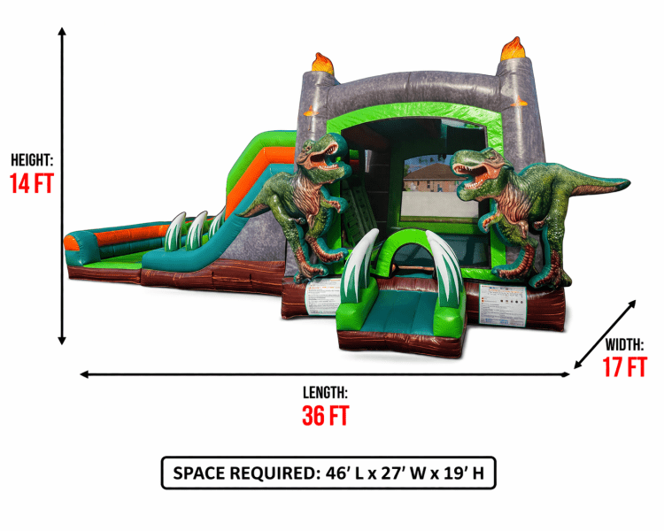 Step back in time and make a splash in prehistoric style with our Dino Land Double Lane Combo! This jaw-dropping inflatable features towering T-Rexes, a volcanic entrance, and two thrilling lanes that end in a refreshing pool—perfect for beating the heat!
