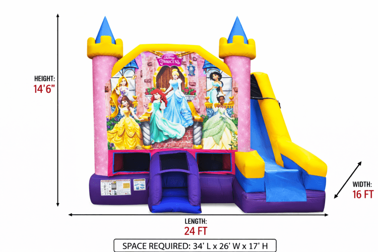 Step into a fairy tale adventure with the Disney Princess Combo with Bumper! This enchanting inflatable isn’t just for jumping—it’s a magical kingdom where every leap feels like flying alongside your favorite Disney princesses.