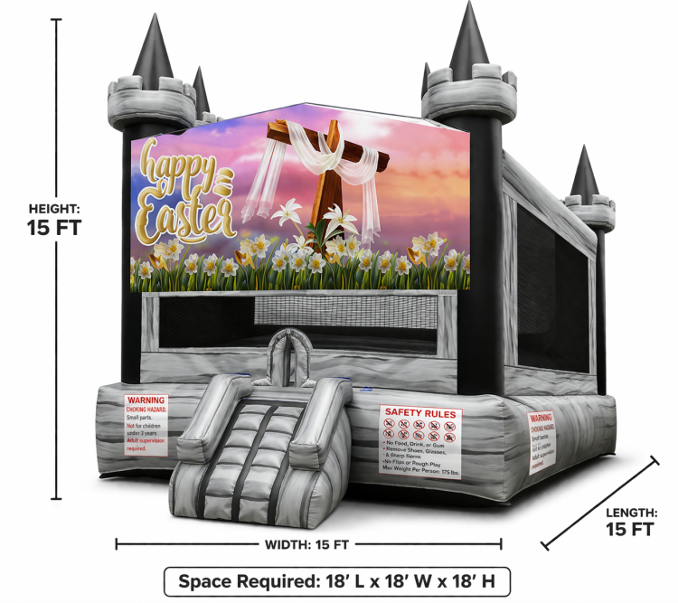 Celebrate the joy of Easter with this beautifully themed Happy Easter Bounce House! Featuring a vibrant cross adorned with lilies and a flowing white cloth, this inflatable is perfect for church events, spring festivals, egg hunts, or any faith-based celebration.