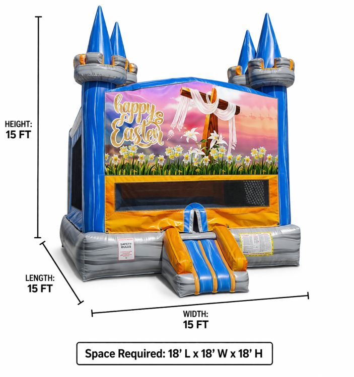 Celebrate the joy of Easter with this beautifully themed Happy Easter Bounce House! Featuring a vibrant cross adorned with lilies and a flowing white cloth, this inflatable is perfect for church events, spring festivals, egg hunts, or any faith-based celebration.