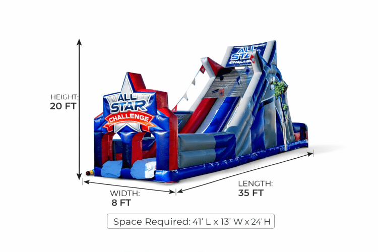The All Star Challenge Slide is an exhilarating inflatable slide that takes the excitement at any event up a notch. Perfect for parties, festivals, or any gathering where fun is on the agenda, this slide is not just a slide—it's a test of agility and speed, inviting participants to race up and dash down its lofty height. It's a fantastic way to add a competitive edge to the joy of bouncing and sliding, making it ideal for kids and teens craving adventure. As a rental, it promises to be the centerpiece of entertainment, providing hours of active fun and laughter for everyone brave enough to accept the challenge.