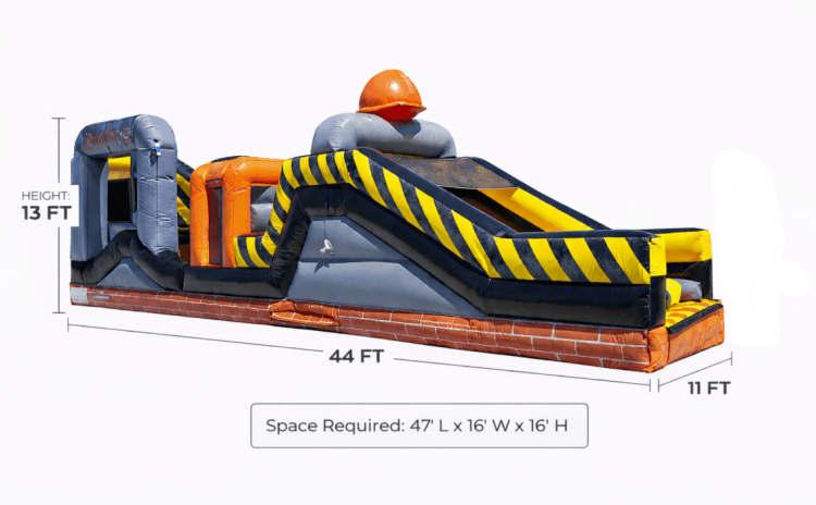 Let the race begin at the ultimate inflatable job site! This 44-foot construction-themed obstacle course is designed for high-energy fun with a bold hard-hat design, caution tape graphics, and exciting features throughout.
