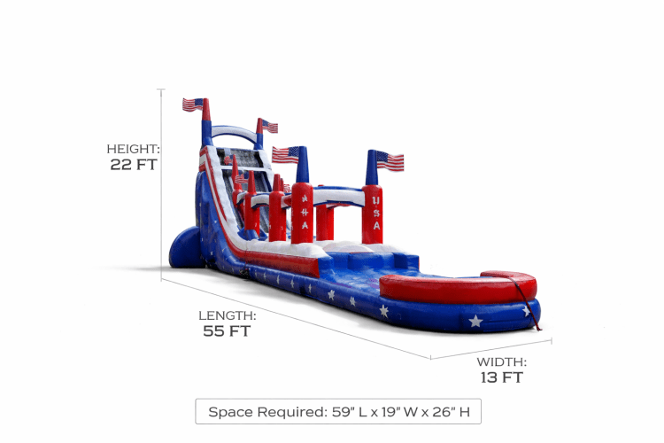 Celebrate in red, white, and blue style with our American Flag Slide Combo! This patriotic inflatable packs double the excitement—start by zooming down the bold, star-spangled slide, then glide across the slip & slide runway before making a splash into the pool at the end! ๐๐
